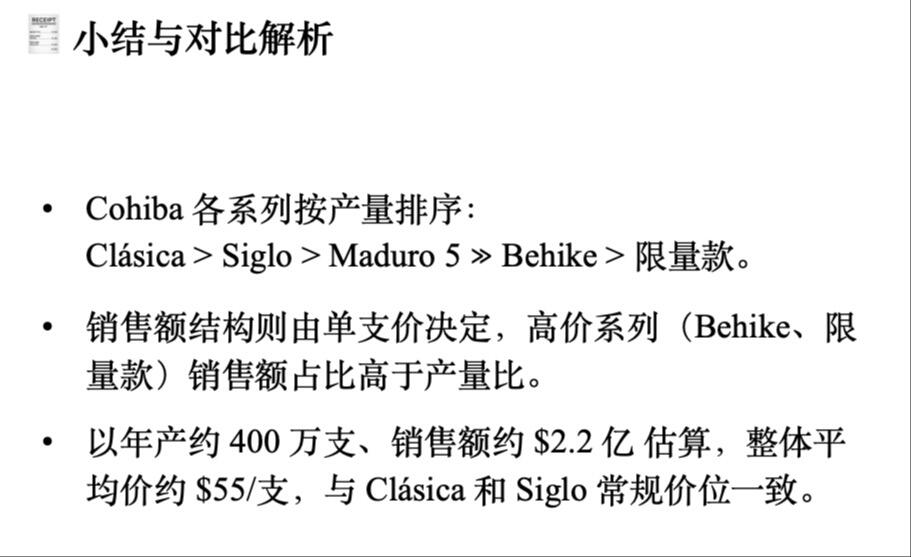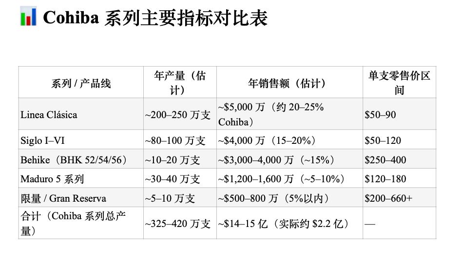 2024年Habanos S A全品牌总销售额为8.27 亿美元,其中包括 Cohiba、Montecristo、Romeo y Julieta、Partagás、Hoyo de Monterrey 等 27 个品牌; Cohiba 是最贵、最有名的品牌,其销售额估算在总额中约占 25–30%;约2.2亿美元。