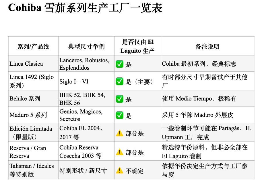 一些限量与特别版雪茄,即使标注为 Cohiba,有时出于产能或策略考虑,也会委托其他顶级古巴工厂协助生产,尤其是某些年份的 Edición Limitada 或 Gran Reserva;当然大家不必因它外发加工担心品质,所有 Cohiba 都须通过 Cubatabaco 和 Habanos S.A. 的最终质量监控。其实我本人一直觉的其它大厂生产水平也不比EL Laguito差🤭