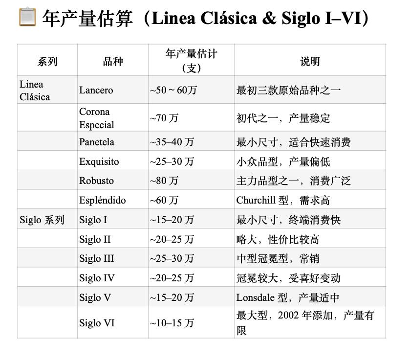 cohiba仍旧以早期的经典系列linea clasica和1992年研制的世纪系列siglo为主,两个系列产量约占2/3, 加上尊贵的Behike以及Maduro 5,这4款始终是 100% 由核心工厂El Laguito 出品