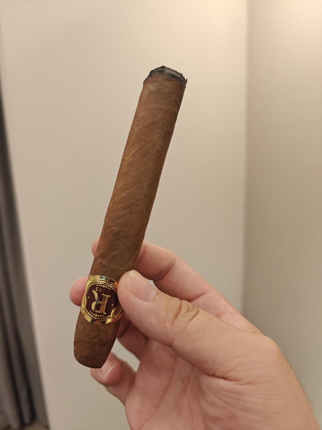 鱼雷茄剪起来和拿在手里总觉得有一种帮派的气质,剪开后冷抽有一股发酵味道,熟悉的古巴茄衣味。点燃后能品尝到花香和轻微的木甜,烟气量不大,非常柔和,过鼻也很舒服并且烟气闻着很舒服,过了一段后有一些淀粉的甜感。