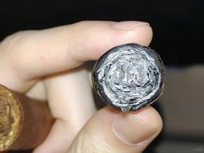 隧道式燃烧:表现为雪茄中间燃烧快,四周燃烧慢,呈现内凹式燃烧。这可能是因为雪茄卷制较松,内里烟叶空洞,或者内里烟叶破碎,也可能与养护时温度和湿度不均匀有关。(图三)